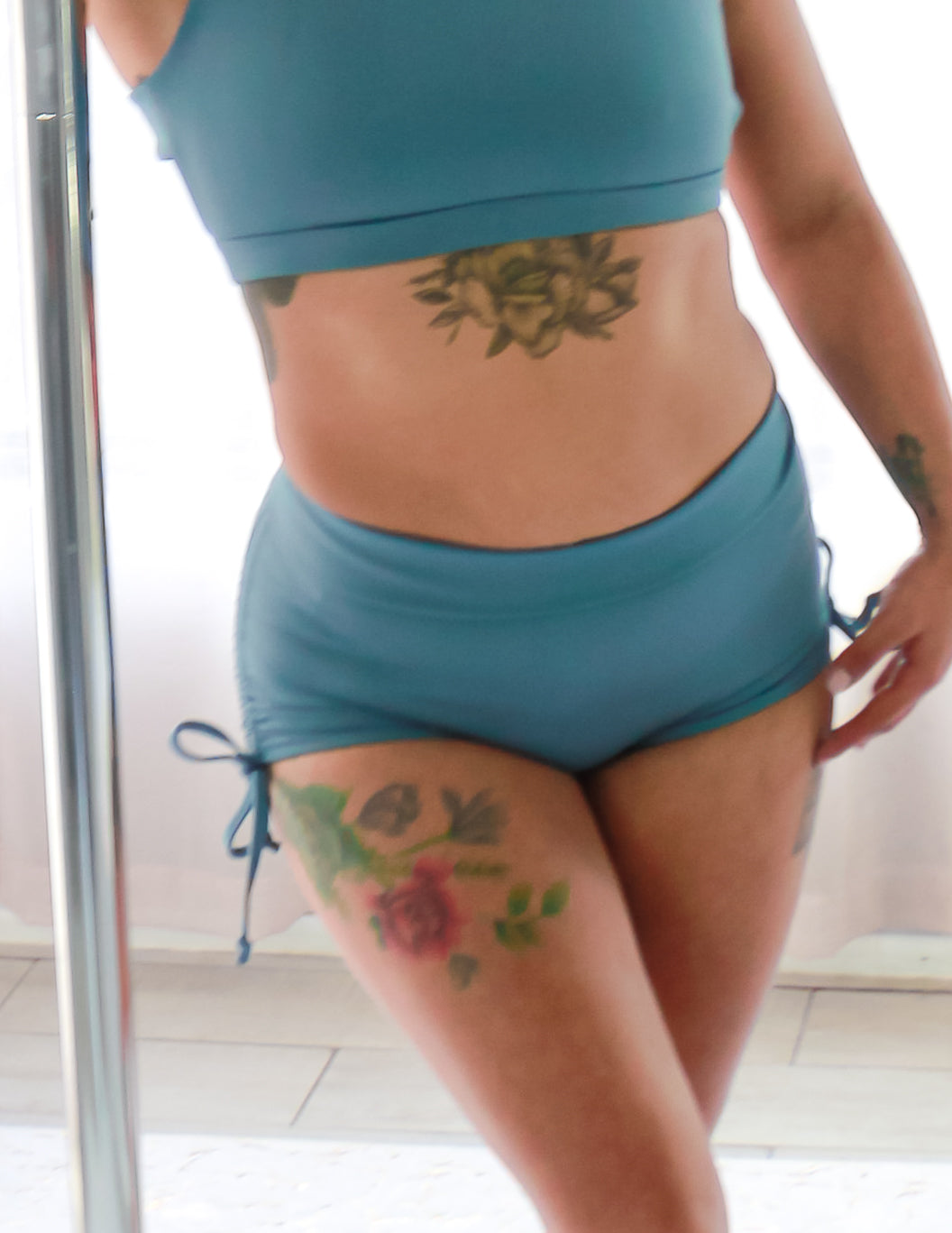 Talk about versatility! The phoenix shorts is a go-to for whatever mood you're in. Feeling bloated- flip the band up for a comfortable high waist. Feeling cheeky- Ruche those side ties to add a little more booty!